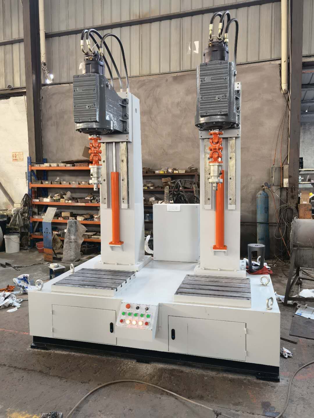 JLX型旋塞閥研磨機是針對硬密封旋塞閥密封面的研磨而精心研制的專用設(shè)備,該設(shè)備采用獨創(chuàng)的正轉(zhuǎn)360度和反轉(zhuǎn)360度,最主要的是正反轉(zhuǎn)一圈還有上下起跳5次功能方式,上下起跳功能就是解決了閥體密封面和閥芯塞密封面不會咬傷和損壞。獲得極高的加工精度、表面質(zhì)量以及批量加工的質(zhì)量一致性。JLX型旋塞閥研磨機分為一工位和兩工位研磨機、一工位研磨機和兩工位研磨機供用戶可根據(jù)要求選配。該設(shè)備通過液壓馬達來控制轉(zhuǎn)速旋轉(zhuǎn),用液壓流量來控制轉(zhuǎn)速快與慢,根據(jù)閥門口徑大小和材質(zhì)來調(diào)整轉(zhuǎn)速快慢,這樣才閥體和閥芯塞配合度為一致。用戶根據(jù)被研磨閥體的工藝要求,選擇合適的研磨劑,粗磨和精磨相結(jié)合,或閥體與閥芯塞浮動對磨。研磨頭通過液壓油缸來上升下降來實現(xiàn)。齒輪箱與主軸采用萬向節(jié)與伸縮桿鏈接,旋塞閥閥體和閥芯塞的垂直通過萬向節(jié)來變動,閥體和閥芯塞用伸縮桿來控制密封面的輕重來實現(xiàn)。裝夾誤差或其它工藝誤差。研磨劑根據(jù)用戶來選擇。JLX型旋塞閥研磨機由立柱機架、導(dǎo)軌及升降機構(gòu)、齒輪箱旋轉(zhuǎn)機構(gòu)、裝夾機構(gòu)等組成,旋轉(zhuǎn)機構(gòu)的旋轉(zhuǎn)中心線相互垂直。立柱與齒輪箱底板的升降功能通過液壓油缸來實現(xiàn),通過按鈕可進行上升或下降。