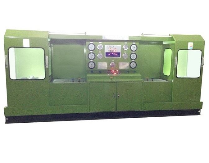 本機由液壓系統(tǒng)、機械部件,電器控制及多極氣源升壓裝置系統(tǒng)等部件組成。液壓系統(tǒng)是本試驗臺的動力主源。用于各類液壓缸和機械件驅(qū)動執(zhí)行功能。試驗面夾爪由液壓缸直接驅(qū)動執(zhí)行,軸向夾緊壓力是按閥門試驗壓力等級不同進行調(diào)節(jié)增壓(最高液壓增壓壓力31 5MPa)。各夾爪受力均,夾緊可靠。徑向移動由液壓缸傳動執(zhí)行,各夾爪進退同步,靈活自如,確保通徑大小不同閥門的測試。多極氣源升壓裝置是利用液氣聯(lián)動增壓。增壓范圍0.6—32 0MPa,用于閥門介質(zhì)壓力試驗。氣源升壓工作設(shè)有自動和手控二種操作選擇,當(dāng)選用自動升壓工作時,工作人員可以近距離離開操縱臺觀察現(xiàn)場試驗情況。