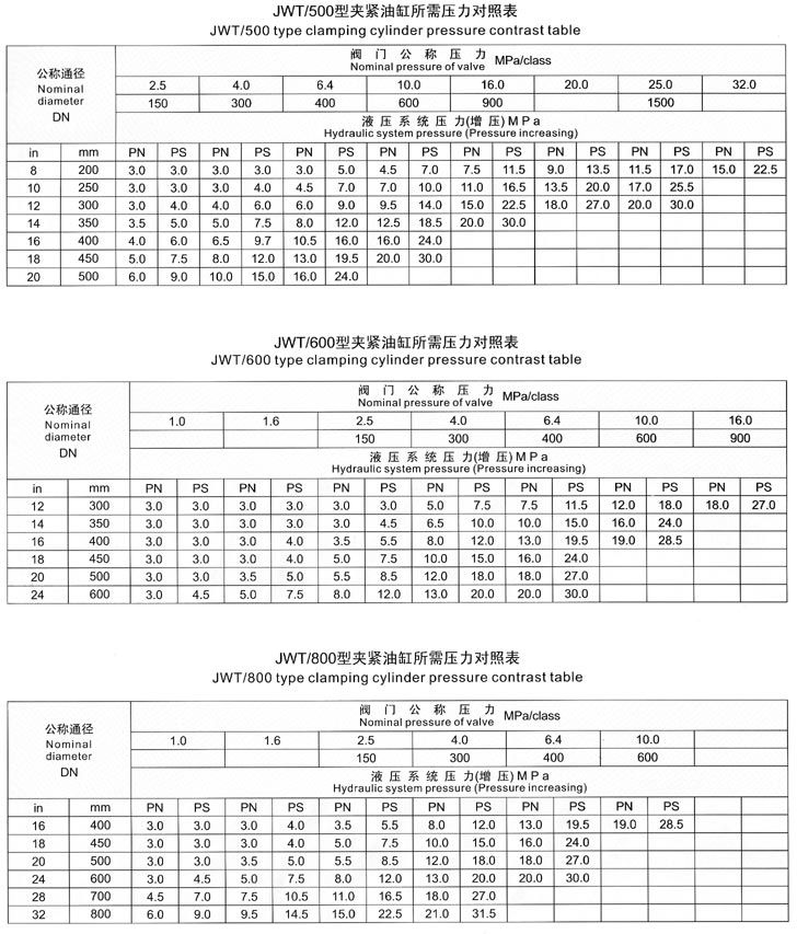 根據(jù)被試閥門公稱通徑和公稱壓力,調(diào)節(jié)電接點(diǎn)壓力表和被試閥門壓力相同。參照《壓緊油缸所需壓力對照表》將壓緊油缸壓力增壓到所需壓力要求。 (注:增壓按鈕可要多次點(diǎn)動,每次按動相隔時間需在5-10秒鐘左右)。